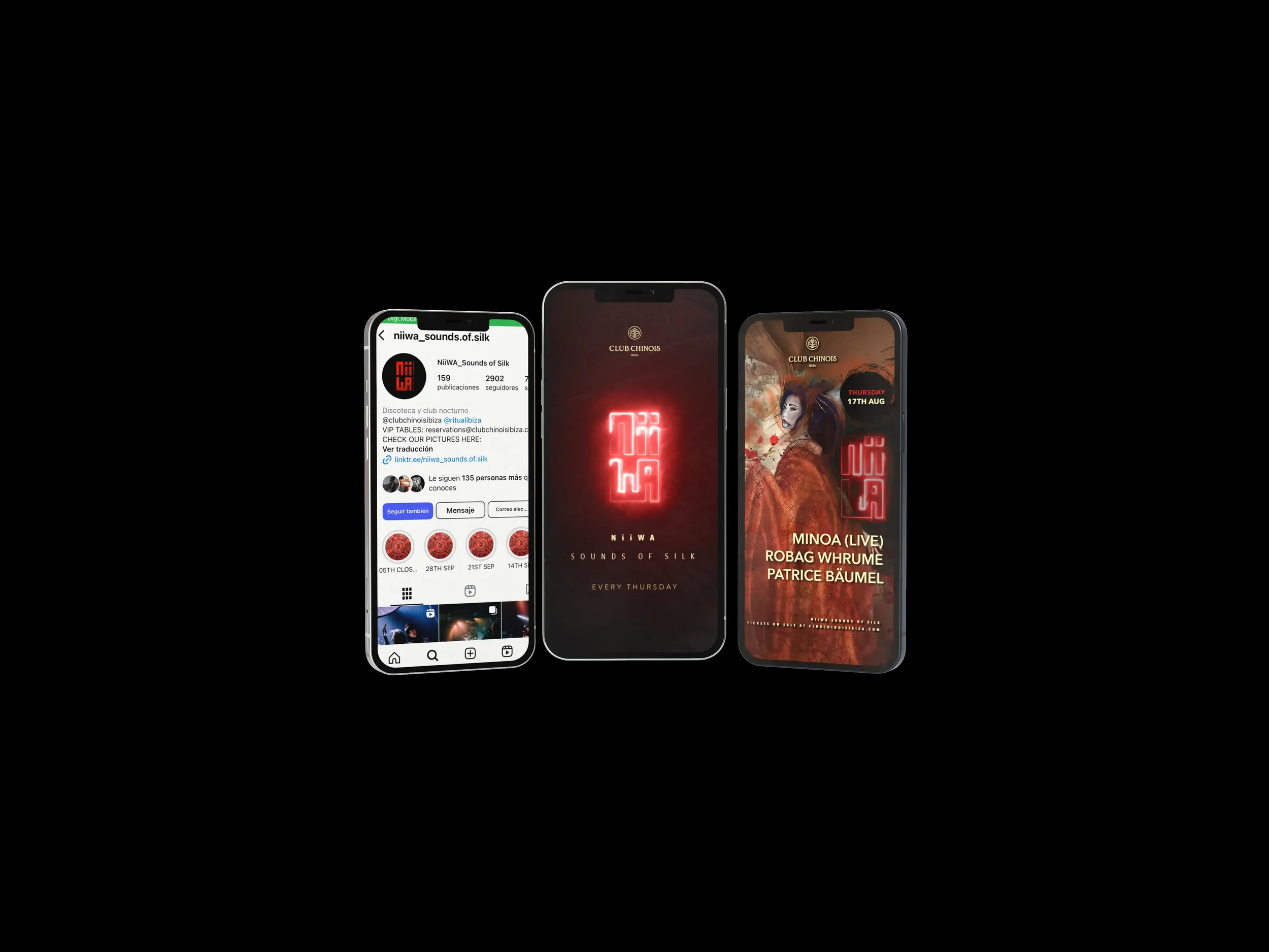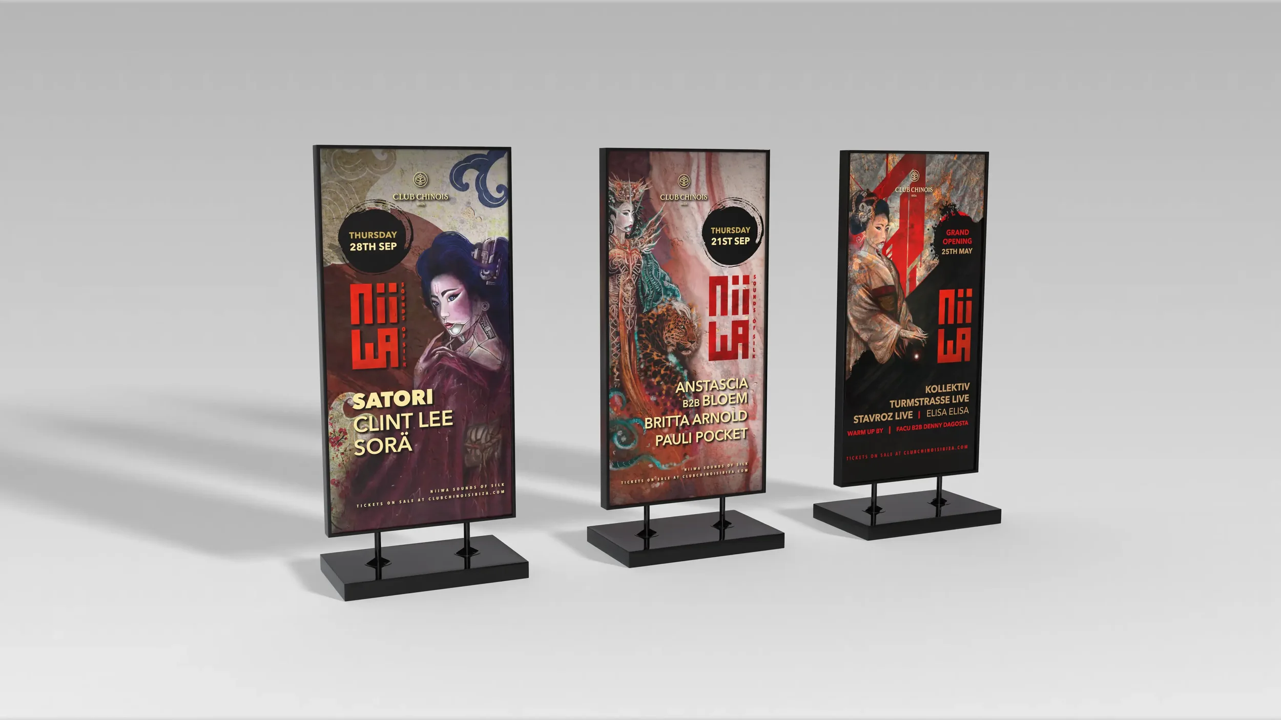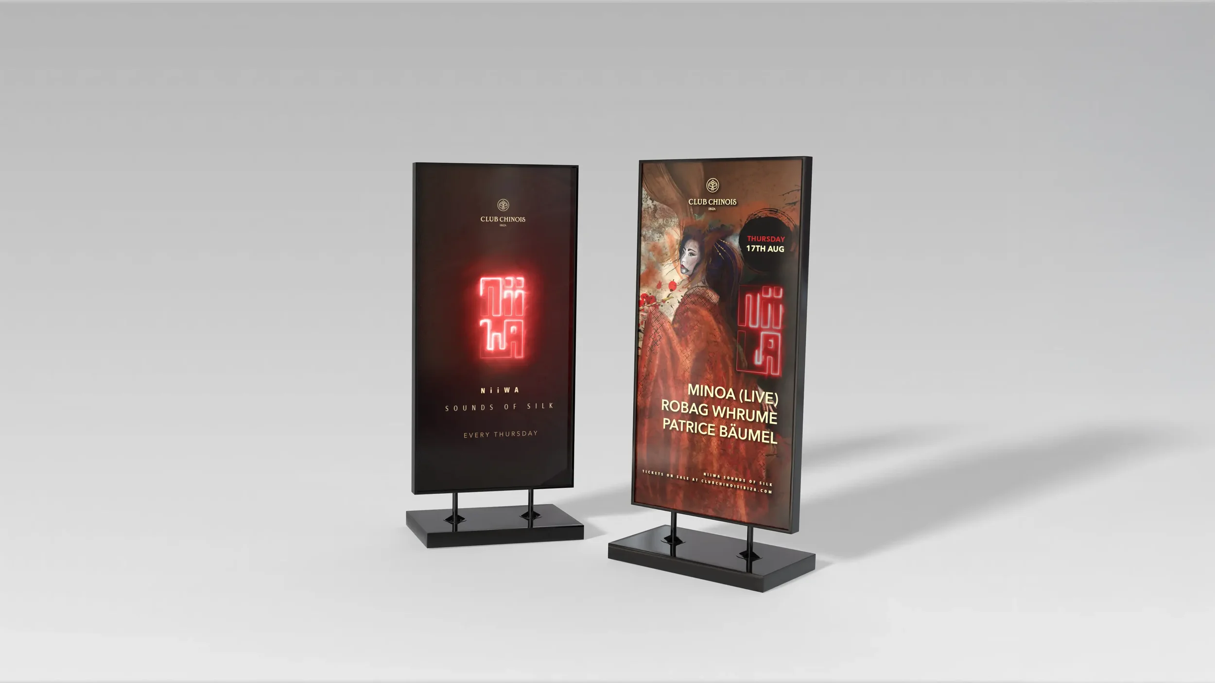 A comprehensive visual identity and motion project for Niiwa — Sounds of Silk, a weekly event series hosted at Club Chinois Ibiza. The project focused on building a distinctive visual language through logo design, animated branding and dynamic motion content, including custom 3D elements, created for large-scale LED screens at the club’s entrance and interior spaces. Weekly line-up posters were developed across static and animated formats, alongside social media assets, paid advertising creatives, press-ready adaptations and video reels capturing the energy and atmosphere of each event. The result is a cohesive visual system supported by a targeted ads strategy, designed to live seamlessly across physical space, digital platforms and nightlife environments.